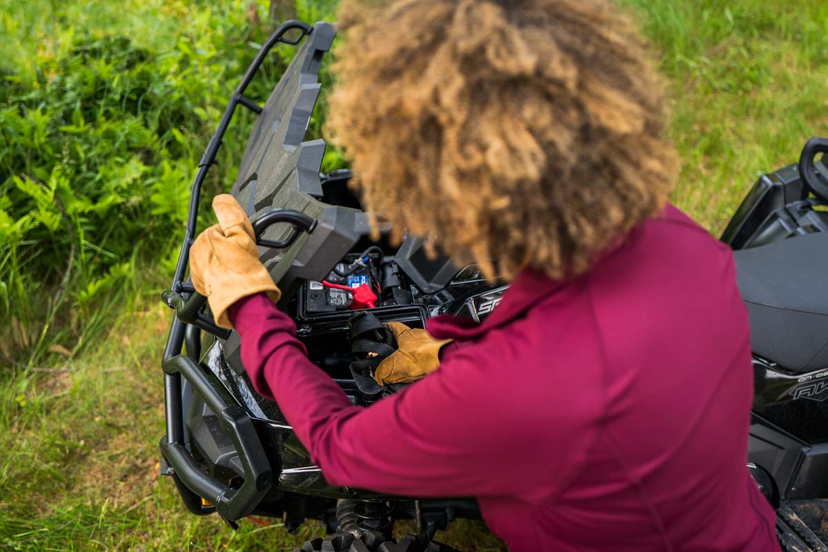 Le Sportsman X2 570 s’adapte à vos besoins grâce à la benne basculante d’une capacité de 182kg qui se transforme en siège passager. En quelques minutes, vous pouvez sélectionner la configuration qui correspond le mieux à votre situation : travailler ou partir en randonnée à deux.